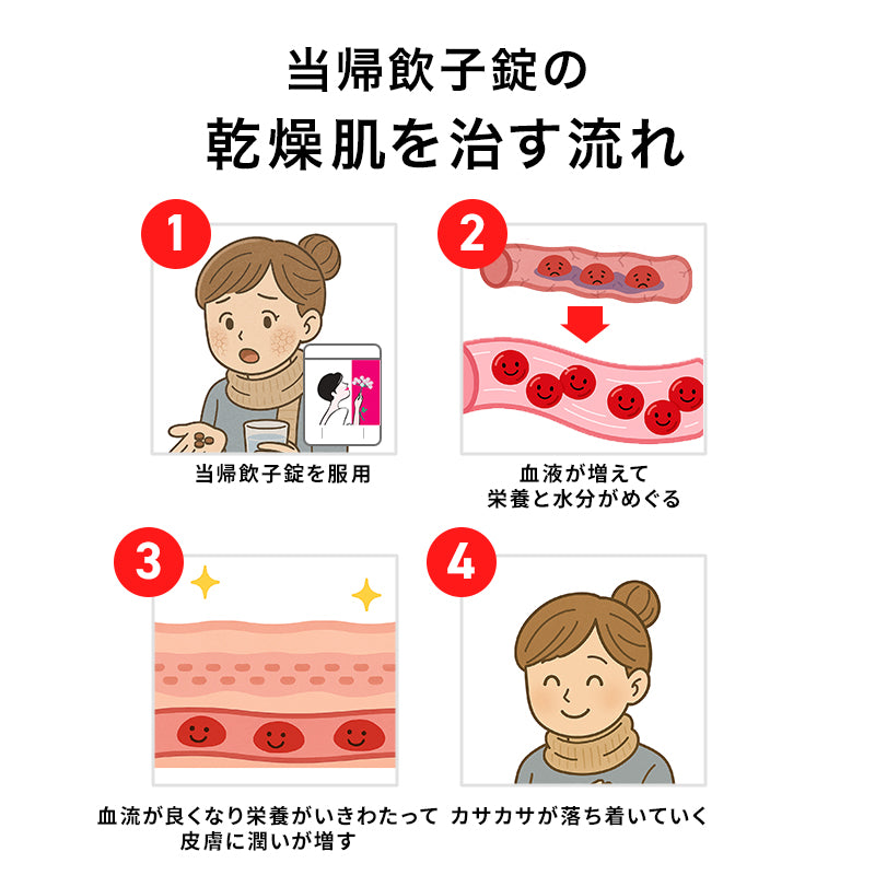 当帰飲子は10種類の生薬が不足しがちな血を補い、体の内側のバランスを整えることで、肌に必要なうるおいを自然に満たしていきます。血が整うことで防御力が高まり、季節の変わり目やストレスで乱れがちな赤みやかゆみを、ゆっくり落ち着かせてくれます。