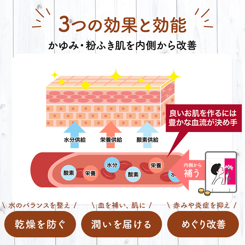 普段から目の周りが乾燥し、血色も悪く痒くてつい触ってしまうことがありました。触るとカサカサが落ちてくるのが嫌で、何度も擦るとシミになると聞き心配していました。そこで、内側からケアできると評判の当帰飲子を試してみることにしました。現在2袋目ですが、以前より目の周りを触ることが減ったと感じています。